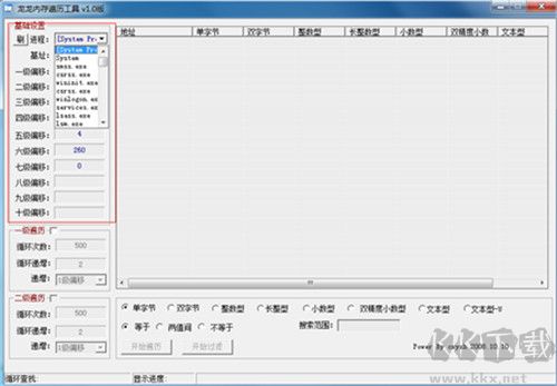 龍龍內(nèi)存遍歷工具是一款精致小巧的綠色CPU檢測工具,界面簡潔、功能實(shí)用。它具備專業(yè)快捷的特性,能幫助用戶快速檢測CPU內(nèi)存,提供System、smsstem、Lsm.exe等進(jìn)程模式,以及基址、一級至三級偏移等參數(shù)設(shè)置,基礎(chǔ)功能可靈活切換使用。 采用動態(tài)過濾技術(shù),過程類似CE的動態(tài)過濾,支持對內(nèi)存塊數(shù)據(jù)逐個掃描。無論是進(jìn)行游戲修改,還是需要獲取內(nèi)存基址時,都能輕松精準(zhǔn)顯示指定程序進(jìn)程的基址與偏移,還可以完成一次遍歷、二次遍歷設(shè)置,十分強(qiáng)大實(shí)用。需要的朋友快來下載試試吧!