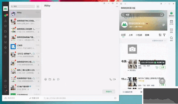 將軟件側(cè)邊欄拖至微信窗口右側(cè),可自動(dòng)貼合界面,方便在聊天同時(shí)進(jìn)行搜索、分享等操作。此外還兼容企業(yè)微信、QQ等常用聊天工具。