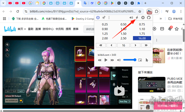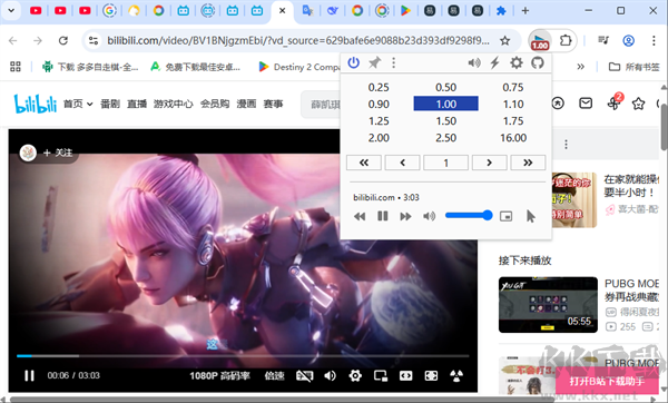 點(diǎn)擊插件圖標(biāo),即可看到0.25倍至16倍的速度選單,點(diǎn)擊所需速率,當(dāng)前視頻的播放速度就會(huì)立即切換。