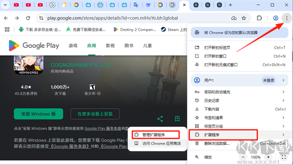 2、以谷歌瀏覽器為例,點(diǎn)擊右上角菜單,選擇“擴(kuò)展程序”→“管理擴(kuò)展程序”;