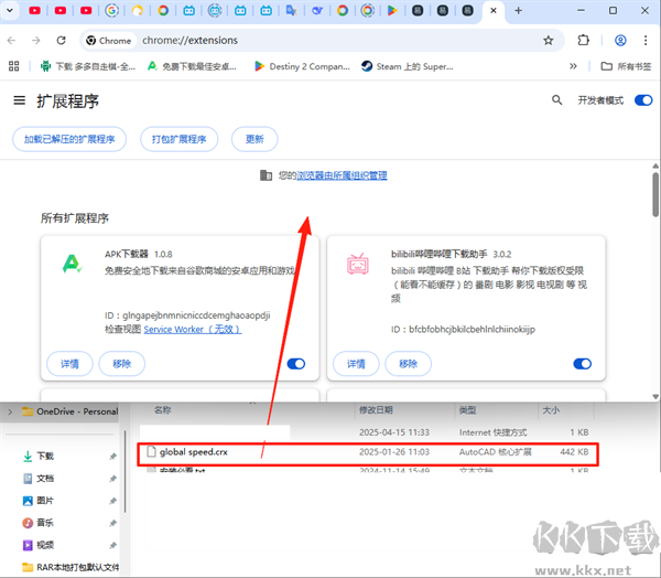 3、將壓縮包直接拖入擴(kuò)展程序頁(yè)面(需保持開(kāi)發(fā)者模式開(kāi)啟);