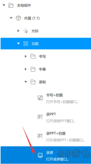 1、通過本地組件:依次選擇“內(nèi)置”→“功能”→“錄制”→“錄屏”。