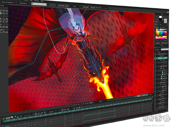 直觀且高效的綁定機(jī)制幫助用戶快速為角色與物體構(gòu)建骨骼結(jié)構(gòu)。綁定功能涵蓋正向與反向運(yùn)動(dòng)學(xué)、釘連骨骼、約束設(shè)置、自動(dòng)拉伸壓縮效果,以及流暢的動(dòng)畫遷移支持。
