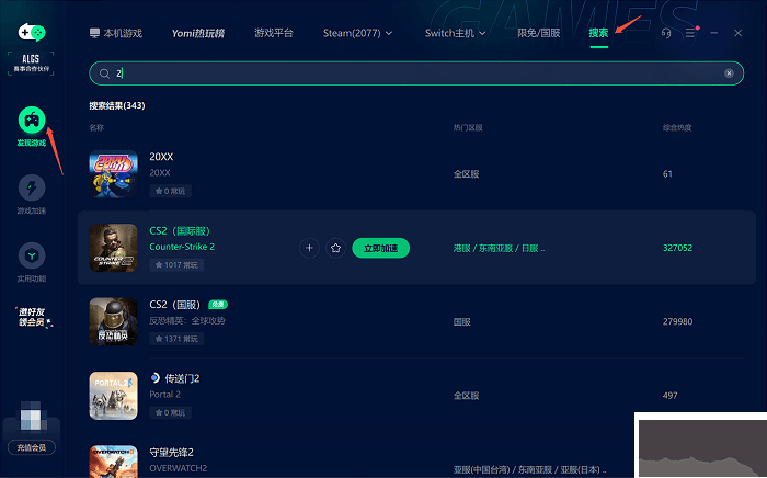 1、通過(guò)“發(fā)現(xiàn)游戲”搜索目標(biāo)游戲,選擇“添至首頁(yè)”或“立即加速”;