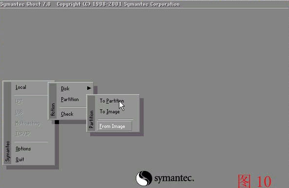 3、 回車后 就會(huì)進(jìn)入GHOST 的操作界面 選擇菜單到 Local(本機(jī))--Partition(分區(qū))--From Image(來至鏡像)