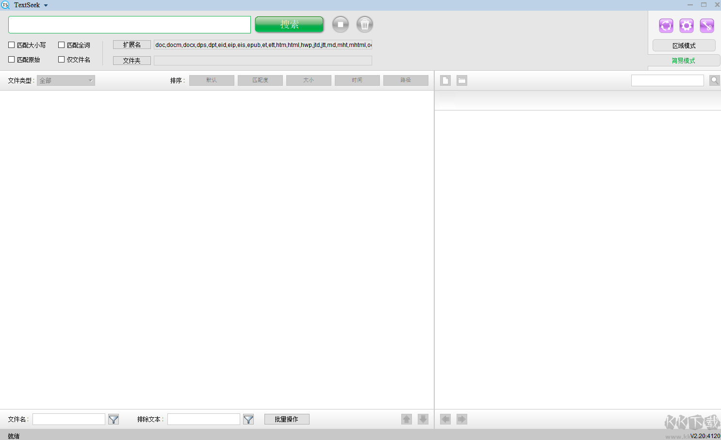 TextSeek提供兩種檢索模式:區(qū)域模式與簡易模式。用戶可通過界面右上角的標(biāo)簽按鈕進(jìn)行切換。