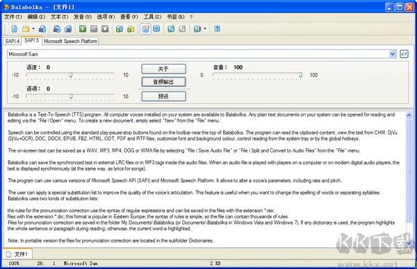Balabolka 基于微軟語音接口(SAPI)多個版本開發(fā),能夠調(diào)整語音的各項參數(shù),如語速和音高。