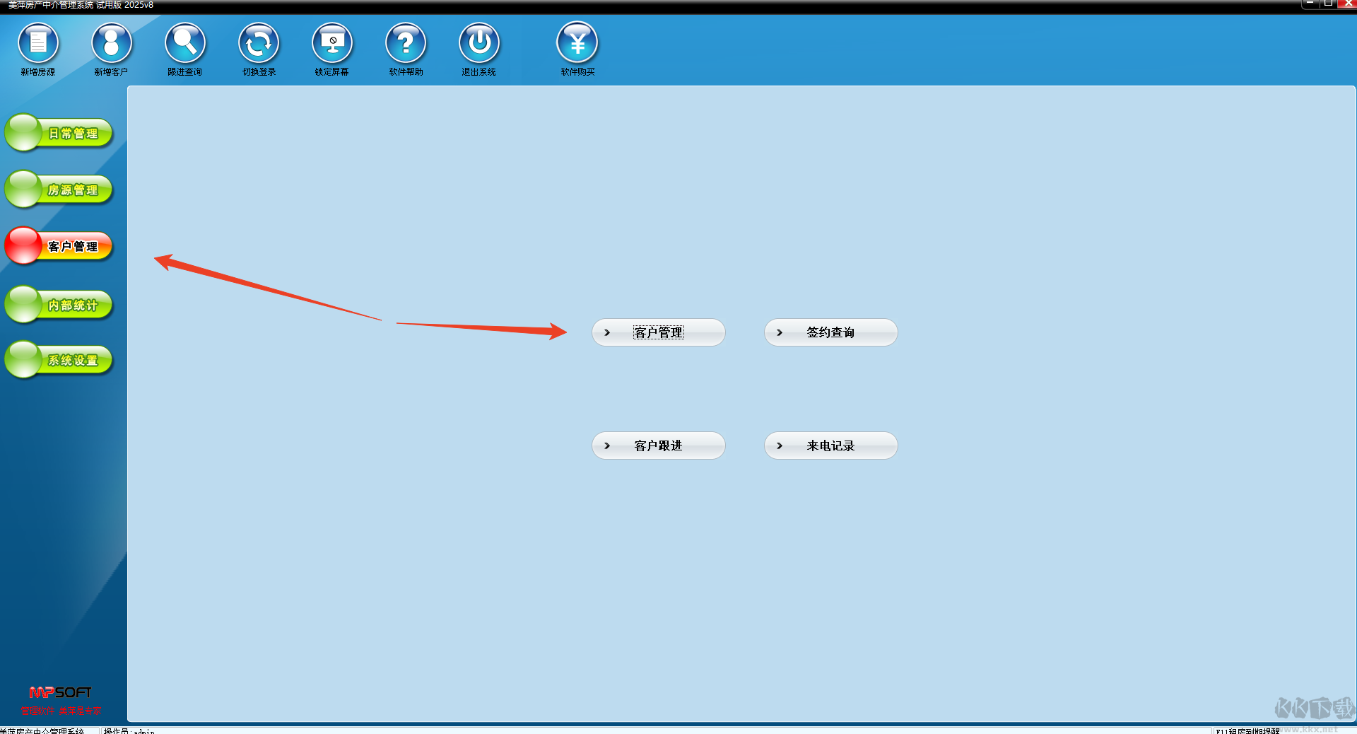 4、客戶管理模塊涵蓋普通客戶維護(hù)、來電跟進(jìn)及簽約查詢等功能。