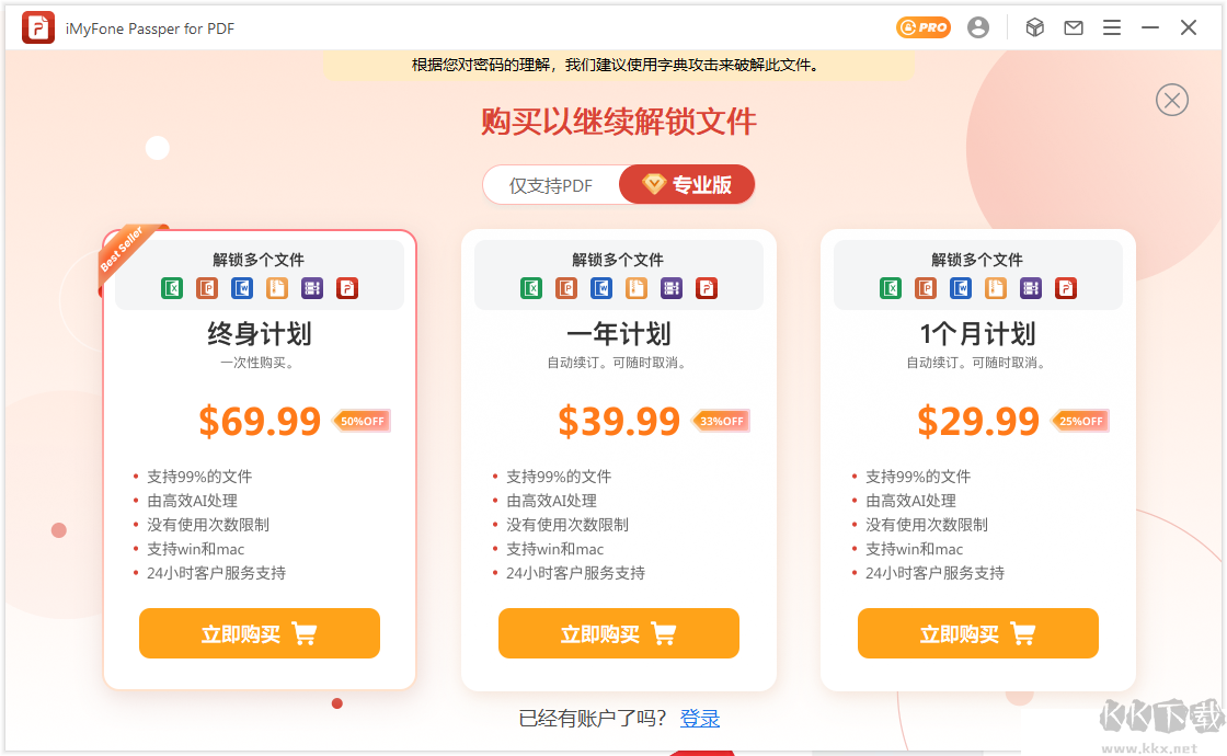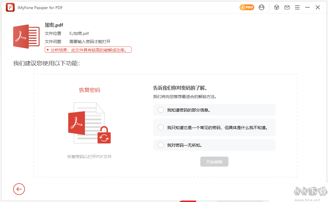 Passper for PDF是一款專業(yè)的PDF密碼恢復(fù)工具,提供四種密碼破解方式,包括字典攻擊、組合攻擊、掩碼攻擊和暴力破解。它可以獲取PDF文件的打開密碼或權(quán)限密碼,恢復(fù)結(jié)果將直接顯示密碼內(nèi)容,方便我們查看和使用。