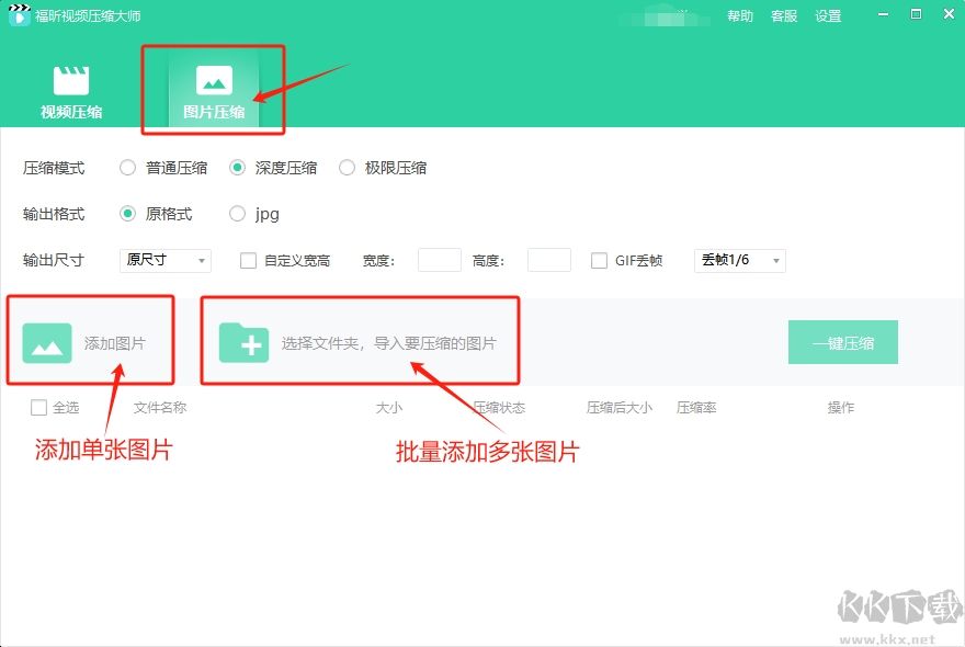 步驟二:在【圖片壓縮】選項(xiàng)下,選擇壓縮模式(普通壓縮/深度壓縮/極限壓縮)以及輸出圖片的格式和尺寸,點(diǎn)擊【添加圖片】上傳單張圖片,或是點(diǎn)擊【選擇文件夾,導(dǎo)入要壓縮的圖片】批量添加多張圖片;