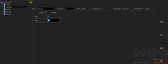 4、如下新建幾個(gè)鍵,并選擇MyHash鍵,則視圖顯示相關(guān)信息,我們可以點(diǎn)擊表格字段進(jìn)行修改值,修改完成需要鼠標(biāo)右鍵或點(diǎn)擊右邊提交按鈕,使其生效。當(dāng)然,Key對(duì)應(yīng)的MyHash也可以修改,即重命名鍵值。