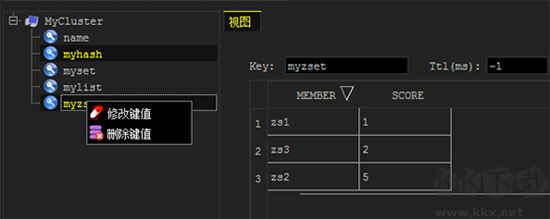 5、選擇左邊鍵值,可以進(jìn)行修改和刪除操作,如下,我們選擇myhash和myzset鍵,然后鼠標(biāo)右鍵點(diǎn)擊刪除即可移除。