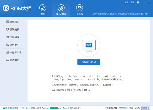 ROM大師是一款簡(jiǎn)單易用又專(zhuān)業(yè)的rom文件解包打包工具,支持所有機(jī)型的ROM編輯,支持*.img、*.cpb、*.app、*.pac、*.bin、*.binx、*.ext4、*.qsb、*.dat、*.tar、".tgz、*.rar、*.new、*.dat、*.tar、*.md5、7z、zip等格式的解包打包,支持系統(tǒng)精簡(jiǎn)、信息修改、權(quán)限編輯、內(nèi)置ROOT、系統(tǒng)美化,可以任意刪除不需要的內(nèi)置軟件,是一款專(zhuān)業(yè)強(qiáng)大的ROM定制工具!