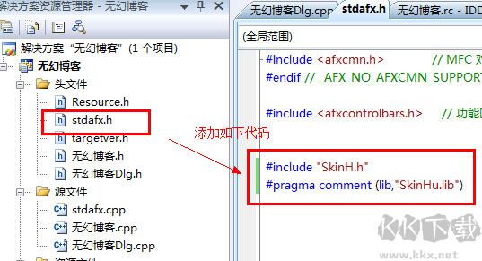 2、將換膚庫(kù)頭文件和鏈接庫(kù)文件(SkinH.h , SkinHu.lib )拷貝到工程的目錄下;