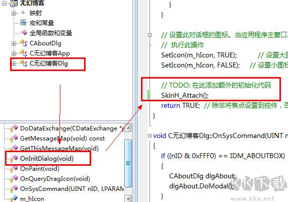 4、在工程的對(duì)話框初始化函數(shù)里面添加以下代碼,加載皮膚;
