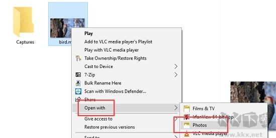 1、打開照片應用程序。首先在計算機驅動器上找到要修剪的視頻文件,然后右鍵單擊“打開方式”>“照片”。