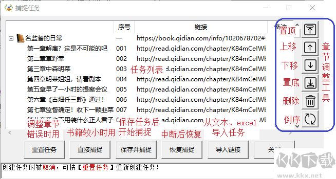 支持任務導入,即從存有章節(jié)頁面鏈接的文本文件、excel 文檔中導入任務進行捕捉;