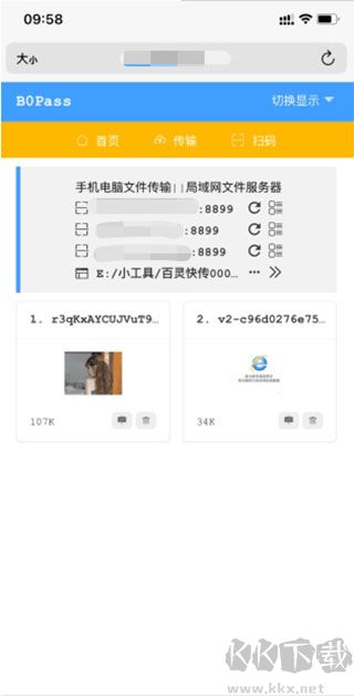 然后在同一局域網(wǎng)下,任意設(shè)備打開(kāi) http://IP地址:8899/ 就能互相傳輸文件了(移動(dòng)端傳輸也可以直接掃碼)。