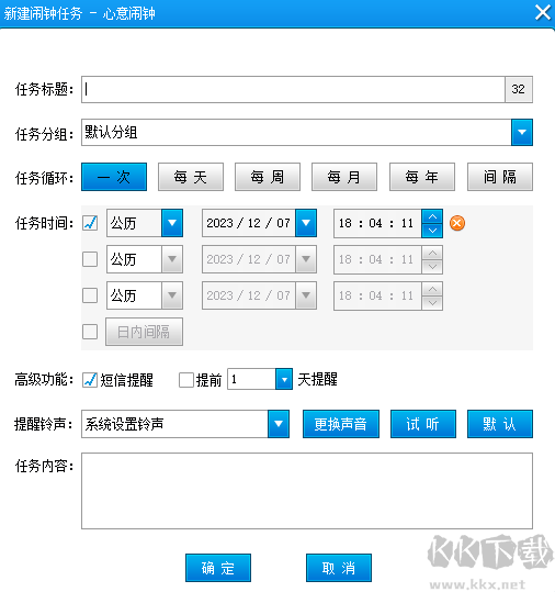 2、填寫任務(wù)標(biāo)題,任務(wù)分組,任務(wù)循環(huán),任務(wù)時(shí)間,高級(jí)功能,提醒鈴聲等信息,鈴聲可以進(jìn)行更換。
