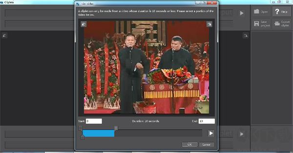 2、這時會自動彈出視頻截取窗口(如果視頻過短便不會彈出此窗口),輸入需要截取視頻的開始時間和結(jié)束時間(你也可以拖動藍(lán)色條設(shè)置開始、結(jié)束時間),然后點擊“ok”按鈕即可。