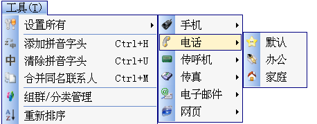 通過工具菜單,可以批量修改聯(lián)系方式的性質(zhì),比如將所有手機(jī)都設(shè)置為缺省,這樣在手機(jī)上操作通訊錄時,不會出現(xiàn)“公”或者“家”這樣的附加性質(zhì)顯示;可以統(tǒng)一添加/清除拼音字頭(僅對名稱的首個字符為中文而言);合并同名聯(lián)系人(姓氏、名字和頭銜完全相同者合并為一個);進(jìn)行組群/分類管理;如果修改了聯(lián)系人的姓氏或者名稱,可以在編輯之后排序,便于查找。