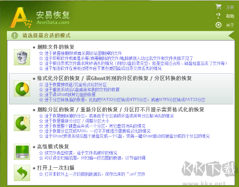 四種恢復(fù)模式(請仔細閱讀選項說明,選擇合適的掃描方式):