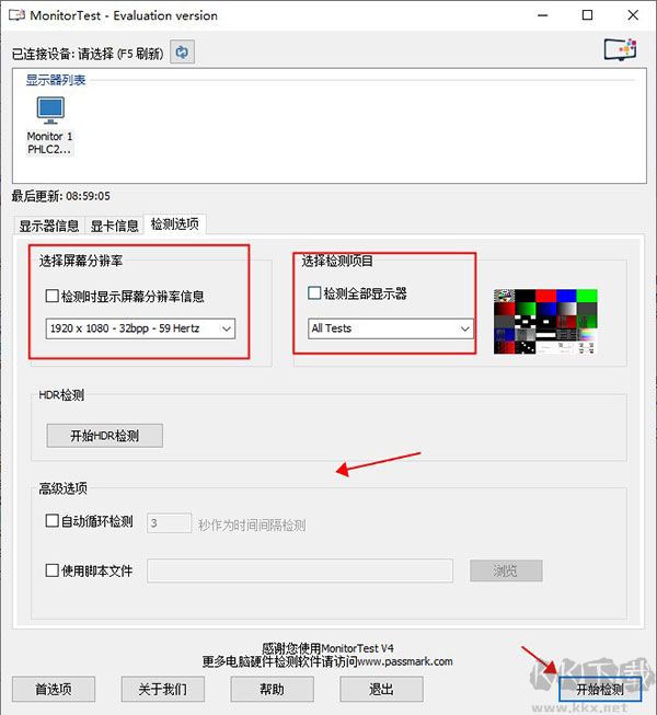 1、選擇要測試的顯示器,或選中“測試所有顯示器”復選框以一次測試所有顯示器(“測試所有顯示器”僅在注冊版本中可用)。