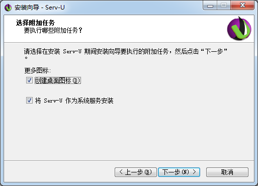 請(qǐng)選擇在安裝Serv一U 期間安裝向?qū)б獔?zhí)行的附加任務(wù),然后點(diǎn)擊“下一步”。