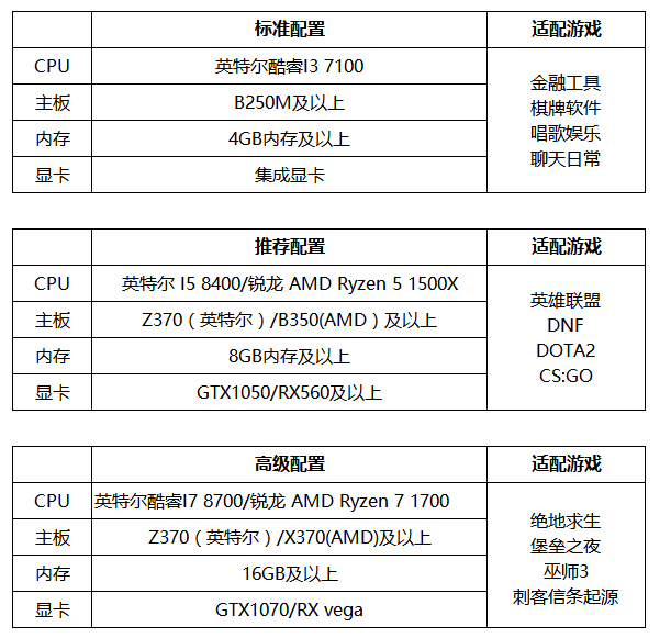 主要以一些熱門游戲英雄聯(lián)盟、DOTA2、絕地求生等為例,推薦機器配置,見下圖所示:
