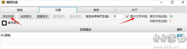 2、先點擊‘設(shè)置’ --> ‘添加目錄’ 按鍵,把要建立索引的目錄添進索引目錄清單,建議勾選上圖片文字識別。