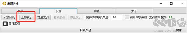 3、首次使用時點擊‘設(shè)置’ --> ‘全部索引’ 按鍵,之后等待索引完成就能搜索;往后有新文檔放進文件夾時可以點擊 ' 增量索引 ' 按鍵完成新文檔的索引。