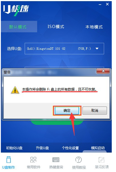 選擇結(jié)束,即可點(diǎn)擊"一鍵制作啟動(dòng)U盤(pán)"按鈕,將會(huì)彈出新的提示窗口,警告用戶在制作U盤(pán)啟動(dòng)盤(pán)將會(huì)格式化U盤(pán),U盤(pán)中的所有數(shù)據(jù)將會(huì)清空,可將U盤(pán)中的文檔文件存儲(chǔ)至本地磁盤(pán)進(jìn)行備份,確認(rèn)無(wú)誤后點(diǎn)擊"確定"即可開(kāi)始制作;
