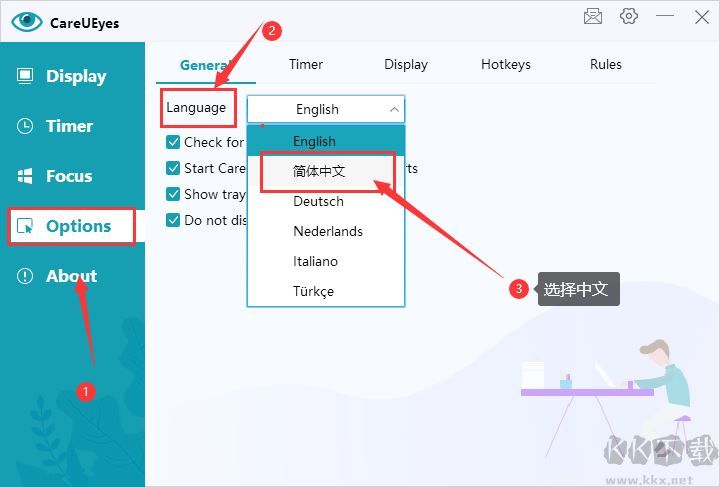 CareUEyes默認(rèn)是英文界面,如果需要中文界面的朋友,可以點(diǎn)擊options-language,選擇簡(jiǎn)體中文即可!
