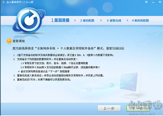 5、點(diǎn)擊"開始重裝"(重裝系統(tǒng)過程中,電腦會(huì)自動(dòng)重啟3次,不要緊張哦!重啟完成后會(huì)自動(dòng)進(jìn)入您的桌面,電腦重啟后進(jìn)入桌面,自動(dòng)啟動(dòng)金山重裝高手,進(jìn)行數(shù)據(jù)還原(系統(tǒng)設(shè)置、驅(qū)動(dòng)、可保留軟件和對(duì)應(yīng)的數(shù)據(jù))。