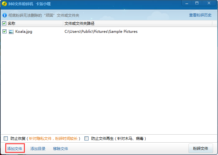 3.點擊“粉碎文件”。在選擇粉碎前還可以勾選防止恢復(針對隱私文件,粉碎時間較長)、防止文件再生(針對木馬、病毒),勾選后粉碎更徹底,不會恢復不會再生。