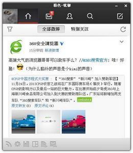 新浪微博桌面是新浪為旗下的微博用戶朋友們打造的一款適用于計算機中使用的基本將Web版微博的功能全部搬到桌面上并進行了優(yōu)化后的桌面版新浪微博客戶端。這款微博桌面除了可以查看微博之外還支持IM即時通信功能,支持在線終端顯示,好友列表分組瀏覽。新浪微博桌面客戶端采用C++開發(fā),速度流暢,不怎么占用空間,是一款適用于Windows操作系統(tǒng)的微博客戶端,歡迎有需要的用戶前來獲取!