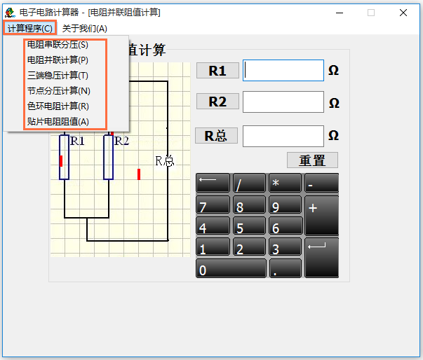 1、將kkx分享的【dianzidianlujsq.zip】解壓出來,打開電子電路計算器.exe文件,即可運行,如圖,點擊【計算程序】,彈出菜單,