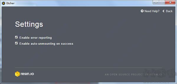 4、下面是Etcher的設(shè)置界面,功能也很簡單,分別是啟用錯誤報告和啟用自動卸載功能,如下圖所示: