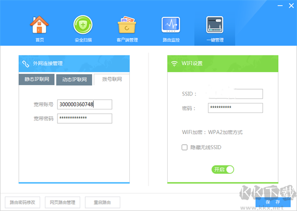 登錄軟件以后,需要設(shè)置好寬帶賬號才可上網(wǎng),用戶可以在“一鍵管理”中找到設(shè)置界面,并將自己的寬帶賬號輸入進去。