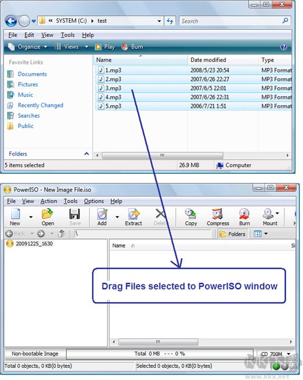 3、將這些文件拖動(dòng)到PowerISO主窗口中,這些文件將被添加到ISO文件。