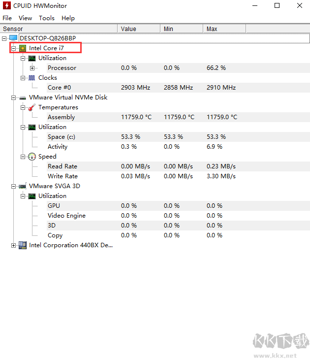 4、通過圖示紅色一欄可以看到CPU的溫度,一般看第一欄Value就可以了,第二、第三欄目是溫度波動的最小值與最大值;