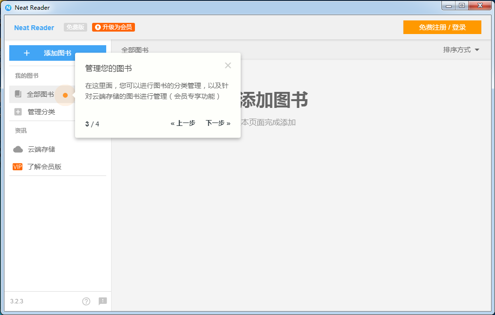 3.在全部圖書功能中,你可以進(jìn)行圖書的分類管理以及針對(duì)云端存儲(chǔ)的圖書進(jìn)行管理,不過(guò)這是會(huì)員功能,需要購(gòu)買的哦。