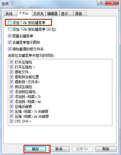 2、勾選添加7-zip到右鍵菜單后點(diǎn)擊確定;