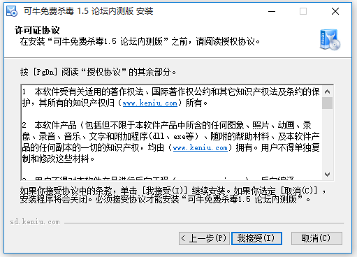 在安裝“可牛免費(fèi)殺毒1.5 論壇內(nèi)則版”之前,請(qǐng)閱讀授權(quán)協(xié)議。