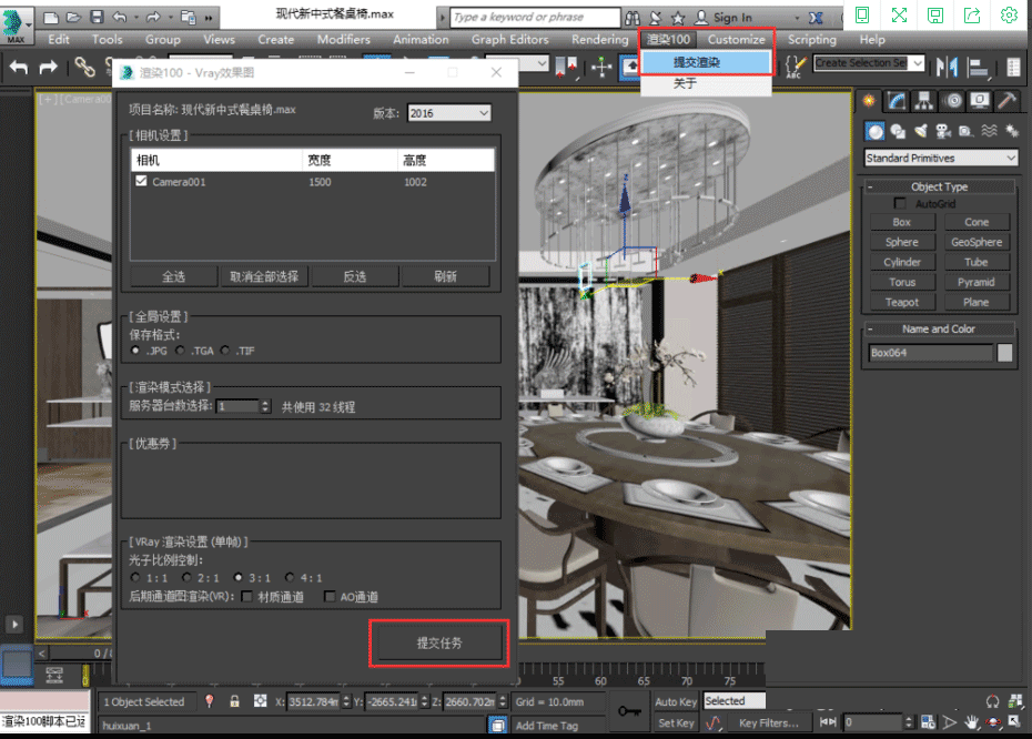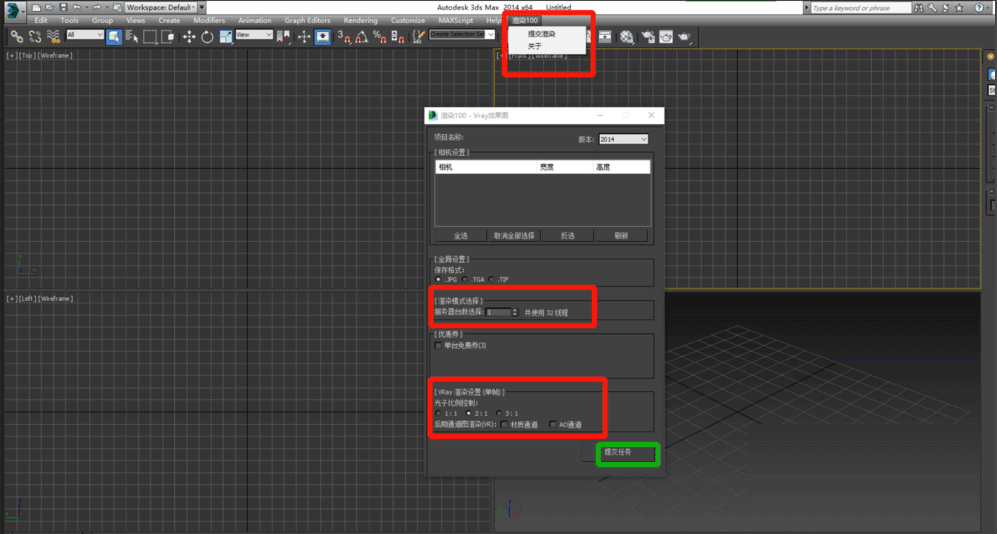 1、安裝好渲染100客戶端,打開3DMAX,找到【渲染100】菜單,點擊提交渲染彈出界面,點擊【提交任務(wù)】