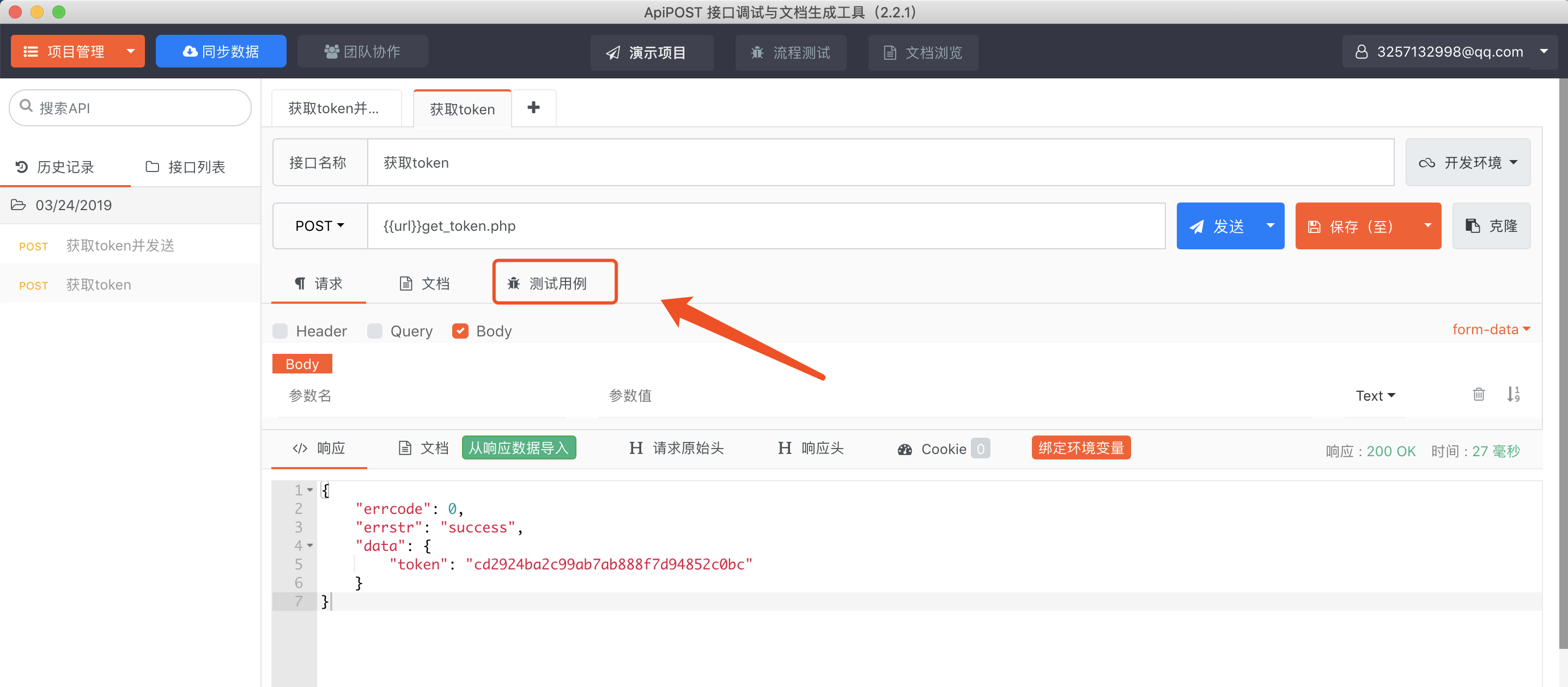 保存測試用例后,點(diǎn)擊發(fā)送按鈕,就會(huì)得到如下測試結(jié)果: