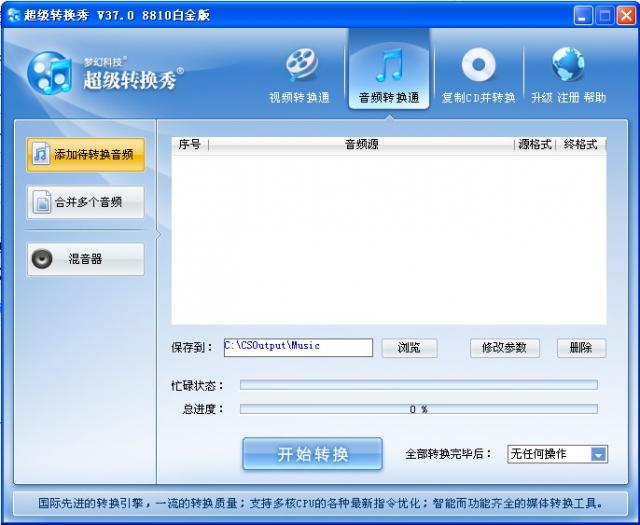 超級轉(zhuǎn)換秀是一款全能的影音視頻轉(zhuǎn)換工具,內(nèi)置視頻轉(zhuǎn)換,音頻轉(zhuǎn)換、復(fù)制CD并轉(zhuǎn)換、添加水印等功能,具有超快的轉(zhuǎn)換速度、轉(zhuǎn)換后依舊保留高質(zhì)量。支持AVI、MPEG1/2/4、VCD/SVCD/DVD、DivX、XVid、ASF、WMV、RM在內(nèi)的幾乎所有視頻文件格式。支持的功能之多,其內(nèi)置國際一流的解壓技術(shù),轉(zhuǎn)換質(zhì)量一流,歡迎需要轉(zhuǎn)換音視頻文件的用戶前來獲取這款超級轉(zhuǎn)換秀破解版!