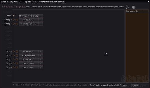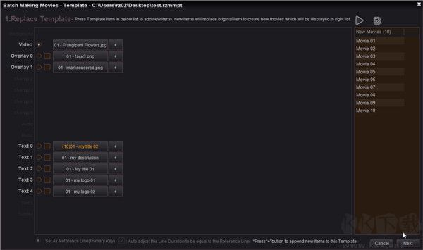 這里我們勾選了 Video line 作為Reference Line,在 Text 0 line 上按下 item "01 - my title 02",然后輸入了 10 個(gè)新的標(biāo)題,所以在右邊的列表中有 10 個(gè)新電影,我們可以按“Preview 預(yù)覽模板”按鈕進(jìn)行預(yù)覽每個(gè)新電影,并按“保存保存模板”按鈕將這些新電影保存為視頻項(xiàng)目文件,然后按“下一步”按鈕。