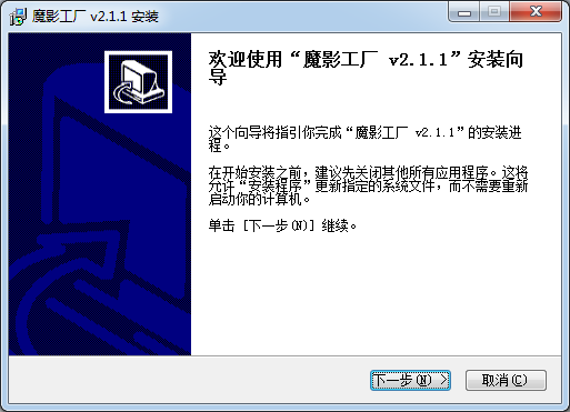 1.打開(kāi)安裝程序,歡迎使用“魔影工廠(chǎng)v2.1.1”安裝向?qū)?br />