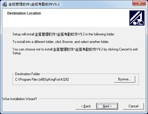 Setup will install金狐管理軟件{金狐考勤軟件V9.2 in the following folder.